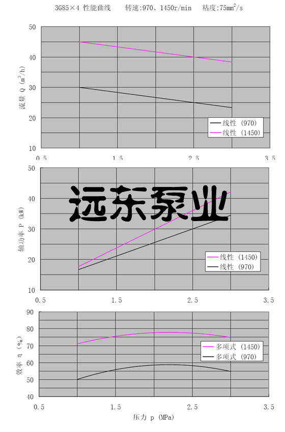 | 3GR85*4三螺杆泵轉(zhuan)速970,1450r/min,粘度75cst性能曲(qǔ)線圖 |